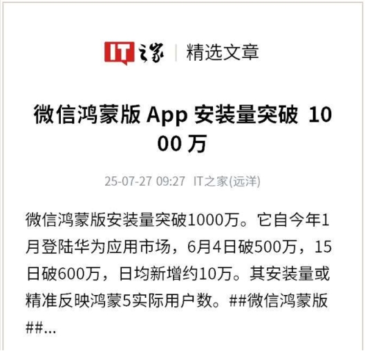 在科技竞争日益激烈的今天,鸿蒙系统宛如一颗冉冉升起的新星,正以独特的魅力吸引着无数用户的目光。近日,鸿蒙版微信安装量突破 1000 万,这一具有里程碑意义的事件,犹如一颗重磅炸弹,在科技圈掀起了轩然大波,也让我们对鸿蒙生态的未来充满了无限期待。