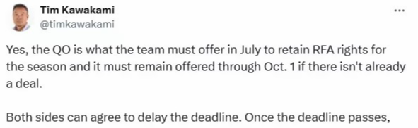那么库明加可以与勇士协商另一个资质报价的截止时间。但也是有限制的,只要过了10月2日,勇士便可以修改报价的金额,此前这个金额由劳资协议的具体规定来确定。到时候勇士可以给他底薪报价、也可以给他顶薪报价,也可以不给任何报价,勇士在报价金额上有完全的主导权,库明加仍然会是一名受限制自由球员。