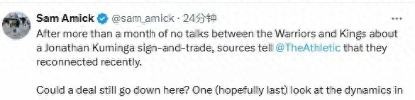 据记者Sam Amick报道,勇士球队消息源告知,双方关于库明加的先签后换的交易谈判在本周早些时候已经重启。也就是说,如果国王做出一些让步,这笔交易真的很有可能即将达成,但勇士明确表示对蒙克没有任何兴趣。
