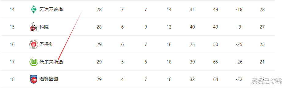 这支曾在2009年奇迹夺冠的球队,自1997年升入德甲后,从未降级,是联赛中的“常青树”。但本赛季,他们的防线彻底崩塌,失球数位列联赛最差之列。进入下半程后长期不胜,让他们直接滑入降级区。即便换帅,也未能止血。目前狼堡积21分,排在倒数第二,比倒数第三的圣保利少4分(降级附加赛的名额)。倒数第四科降27分、第五的云达不来梅28分,并且这两支球队都少赛一场。目前距离安全区差6分,29年的德甲连续征战纪录,正处在断裂边缘。