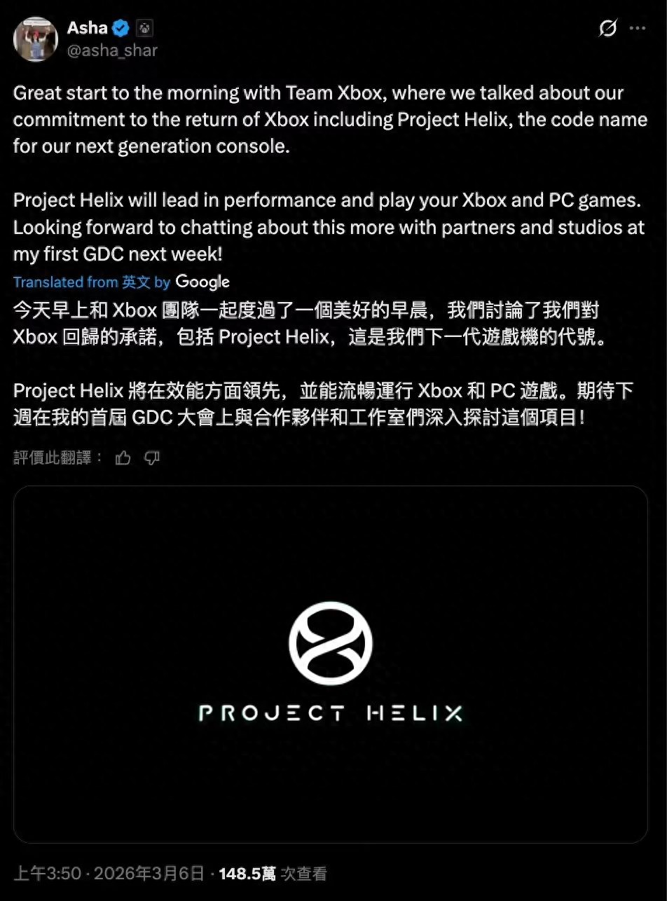 DoNews3月6日消息,微软 Xbox 部门新掌舵人阿莎 · 夏尔玛(Asha Sharma)5 日在 X 平台表示,公司内部已经在讨论下一代 Xbox 主机“Project Helix”。