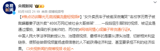 然而随着流量的争夺愈发激烈,一些无底线骗流量的短视频开始层出不穷,它们拿社会矛盾社会痛点做题材,捏造故事情节,通过煽情、夸大事实、制造爽点等手段骗取观众同情和关注,达到获取流量的目的。