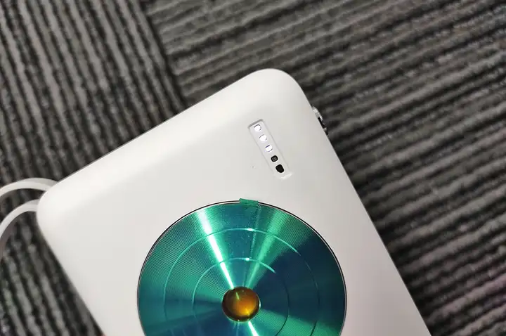 在正面有电源指示灯和快充显示灯,可以操作电源键,查看剩余电量,电量指示灯亮起约30秒后会自动熄灭,同时也有一些装饰性的元素,在使用过程中能较好的反馈,但如能和电源“平齐”设计,没有凹槽会更好。