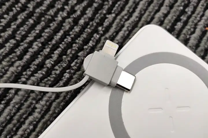 西圣PB无线磁吸移动电源自带快充线,有Type-C+Lightning接口,适用于安卓手机、iPhone等设备,二合一的属性增加了使用的便捷性,同时以卡扣的形式嵌入机身,方便外出携带,在实际使用者,能很方便的达到充电目的,解决不行品牌手机充电的尴尬。