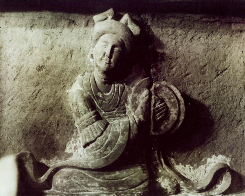 在这支完整的宫廷乐队映衬下,是腐朽的木棺残骸,繁华与寥落交相辉映,令人不免沉思。而棺床后方,一尊石质“写真像”,让人们穿越千年,与墓主人完成“对话”。