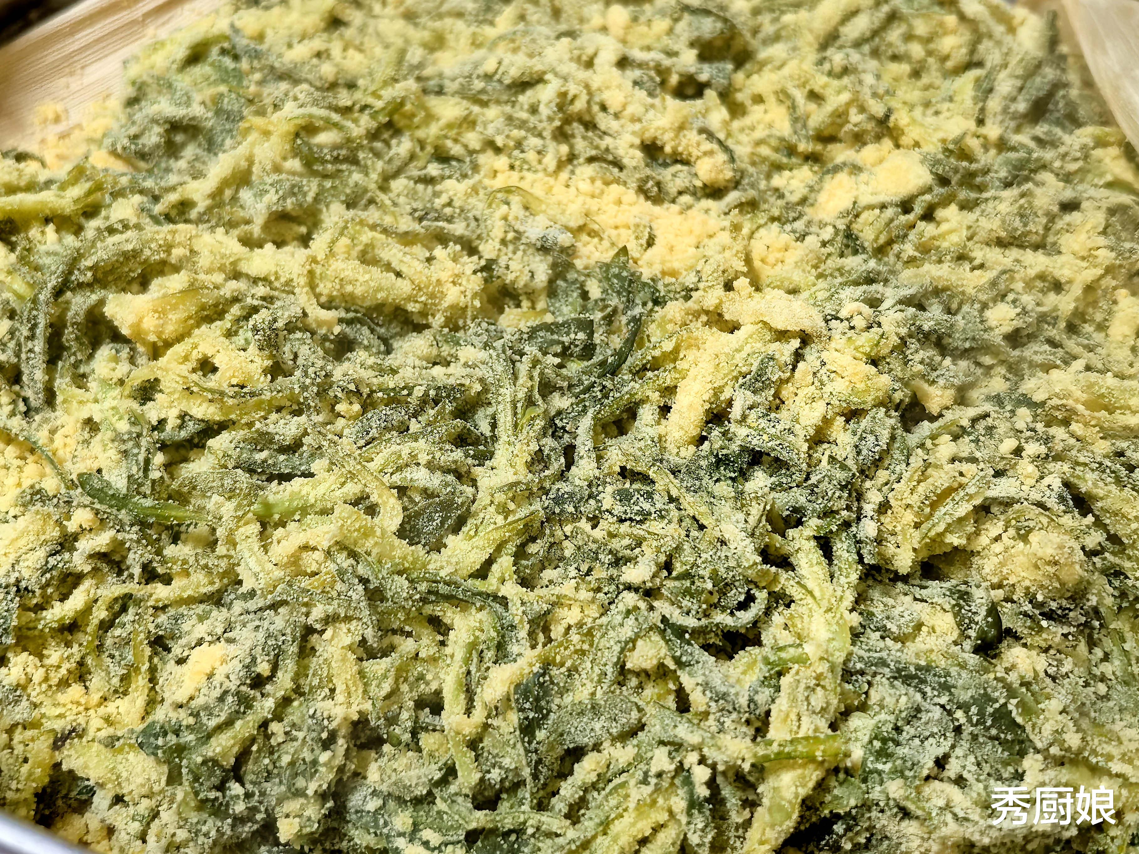 3. 蒸锅里加水烧开,笼屉上铺一块湿笼布,把拌好的面条菜松松地铺进去,千万别压瓷实了。大火烧开转中火蒸,时间不能长,三五分钟足矣!看到菜变软、面粉变熟即可关火,立刻打开锅盖,趁热把菜抖散晾开,防止粘连 。