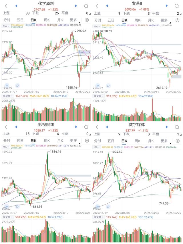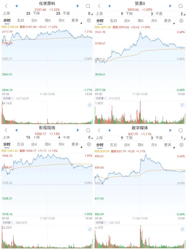 化工、贸易,影视数媒。假期效应明显。高开高走震荡,数字媒体午后还有放量拉升,只是又遇热点回调,震荡中又收窄涨幅,收盘涨幅也一般。