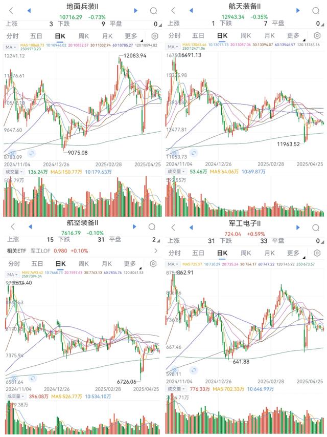 航天装备(10日1天净买入,五日-1.6亿,当日-0.5亿),早已突破10月8日高点,年后反弹宽幅震荡向上,大幅回调又探底,反弹强劲反包巨阴,站上250日均线,日内微绿态势未变;军工电子(10日2天净买入,五日-7.5亿,当日+1.1亿),早已突破10月8日高点,年后反弹宽幅震荡向上,连续回调探底又反弹,反包巨阴后回调,下方仅剩250日均线,日内微涨态势不变;航空装备(10日4天净买入,五日-12.5亿,当日-3.3亿),早已突破10月8日高点,年后震荡反弹力度一般,大幅回调又连续反弹,反包巨阴,站上20、250日均线,日内微绿态势未变;地面兵装(10日2天净买入,五日-3.4亿,当日-1.0亿),早已突破10月8日高点,年后反弹又再创新高,大幅回调再度探底,长阳反包巨阴,探底基本结束,60、120、250日均线在下方,日内微跌又跌破60日均线。