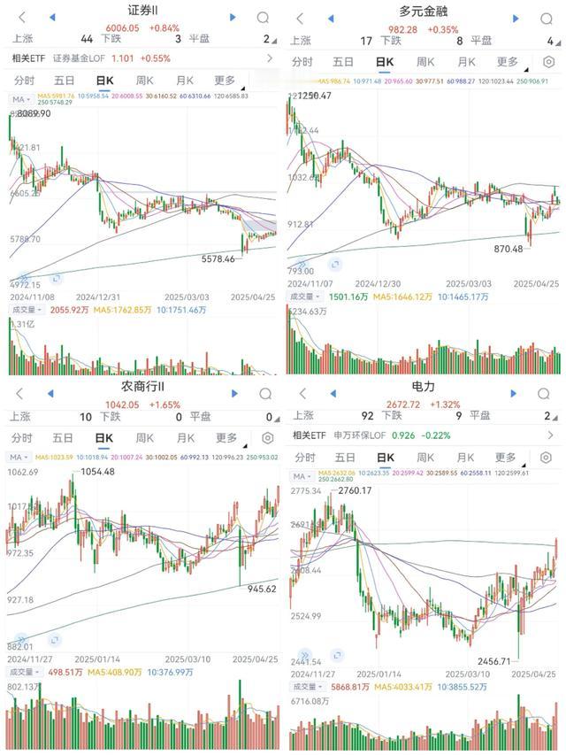 证券、电力、农商行。证券仍徘徊,跟随热点走势,高开高走震荡,小幅冲高回落,收盘涨幅一般,多元涨势细微。农商行高开,震荡小步向上,收盘上涨,涨幅可观。电力平开拉涨,高走震荡,尾盘又拉升,收盘上涨,涨幅可观。