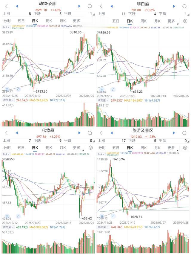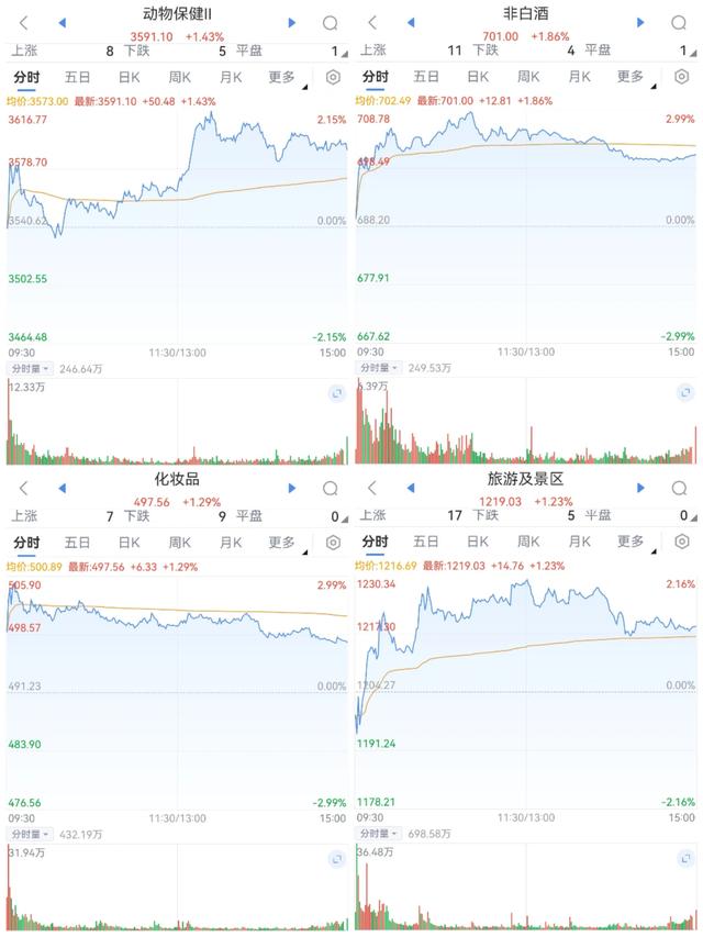 旅游及景区(10日4天净买入,五日-6.6亿,当日+3.4亿),早已突破10月8日高点,年后筑底成功反弹加速,回调又大涨,再创年后新高后回调整理,日内上涨趋势不变;化妆品(10日4天净买入,五日+0.2亿,当日-1.2亿),未突破10月8日高点,走势独立。年后反弹震荡向上,大幅回调跌破所有均线再度探底,连续反弹反包巨阴,结束探底,日内上涨继续反弹中;非白酒(10日3天净买入,五日-2.0亿,当日+1.6亿),仍未突破10月8日高点,年后筑底宽幅震荡反弹,日内上涨仍在宽幅震荡中。