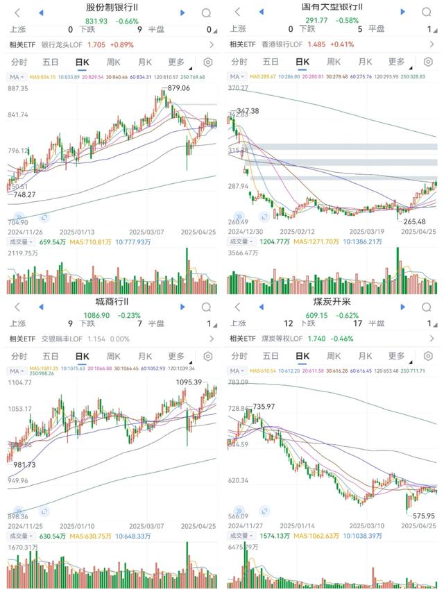 红利,银行、煤炭。四大行高开瞬间拉涨,又创新高,随即下砸,也是转眼之间。下行后震荡,红绿交替,开盘已25分钟。随即大幅向下,略有抵抗,午盘之前,下行超过1个百分点。其它银行跟随,跌幅略小。午后有所回升,震荡略有向上,直至收盘,收盘跌幅也细微。煤炭全天低开低走震荡,跌幅也细微。