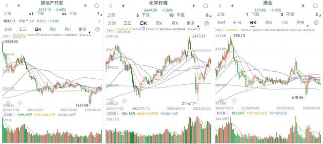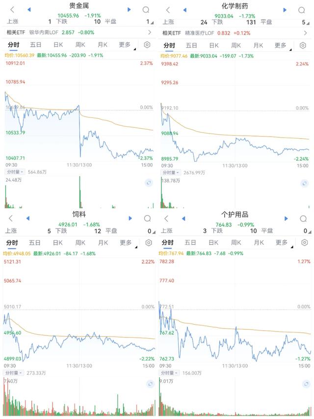 传统产业的贵金属、化学制药、宠物经济(饲料、个护、造纸)、海洋经济(化学纤维、渔业、照明设备)、食品饮料文娱、连锁商业、铁路公路、调味品、出版、教育、房地产、环保、股份制银行和国有大行、医药商业和中药、种植业养殖业、新材料、水泥等,热点中的国防军工(地面兵装)、IP经济(文娱)、AI应用(教育)等跌幅居前