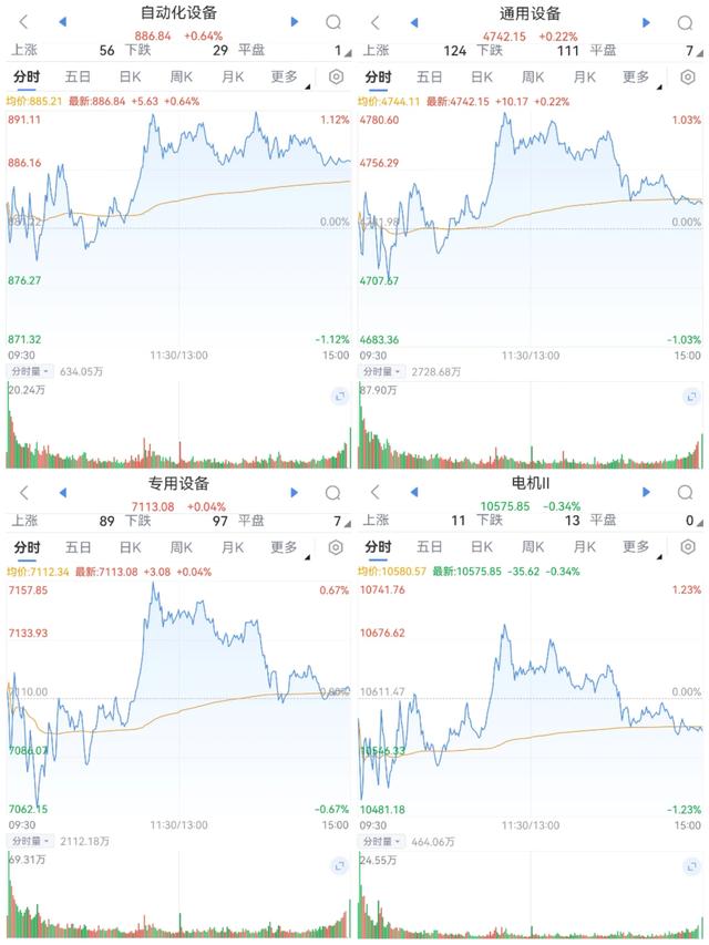 自动化设备(10日2天净买入,五日-8.1亿,当日-0.8亿),早已突破10月8日高点并连创新高,年后反弹又迭创新高,近期连续回调,跌破120日均线开始探底,有所反弹,站上5、10日均线,日内微涨态势未变;电机(10日2天净买入,五日+8.4亿,当日-1.1亿),早已远超10月8日高点,年后反弹又迭创新高,震荡后连续回调,跌破120日均线开始探底,连续反弹站上5、10、20、120日均线,日内微绿态势不变;专用设备(10日3天净买入,五日-16.1亿,当日-4.8亿),早已突破10月8日高点,年后反弹又迭创新高,近日连续回调,跌破120日均线开始探底,连续反弹,收复5、10、20、120日均线,日内微红又跌破5日均线;通用设备(10日3天净买入,五日+3.8亿,当日-3.4亿),早已突破10月8日高点,年后反弹迭创新高,近日连续回调,跌破120日均线开始探底,连续反弹,站上5、10、20、120日均线,日内微红态势未变。