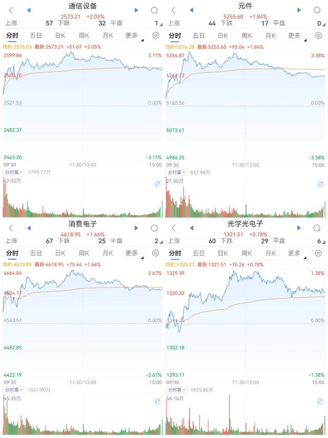 消费电子、通信设备。板块领涨,高开拉升,又震荡上行,走势独立,上行直至午前20分。大盘量能不济?又开始震荡下行,收窄涨幅。午后过半,略有加速,继续收窄涨幅,收盘上涨,涨幅可观;