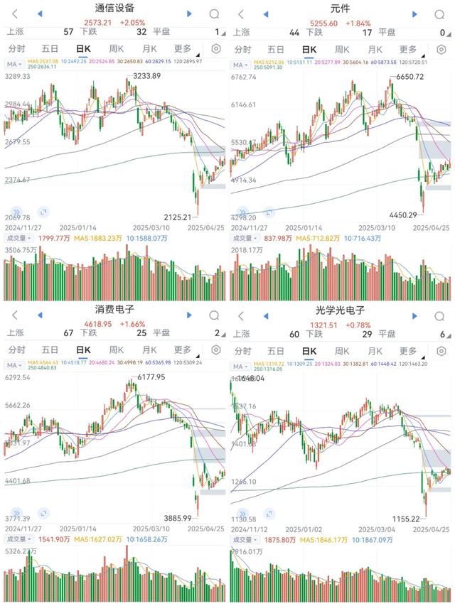 消费电子(10日4天净买入,五日+6.3亿,当日+7.7亿),年后反弹刚突破10月8日高点并连创新高,近日连续回调,跌破250日均线探底中,连续反弹,收复5、10日均线,日内上涨态势不变;通信设备(10日4天净买入,五日-3.1亿,当日+15.4亿),早已过10月8日高点,趋势围绕密集成交区大幅震荡,跌破250日均线探底中,连续反弹,站上5、10日均线,日内上涨又收复刚跌破的20日均线;元件(10日3天净买入,五日-5.8亿,当日+9.8亿),早已突破10月8日高点,年后反弹宽幅震荡连创新高,连续回调,跌破250日均线探底中,反弹后收复10、250日均线,日内上涨又收复刚跌破的5日均线;光学光电子(10日3天净买入,五日-6.6亿,当日+2.1亿),早已过10月8日高点,年后反弹震荡上行,连续回调,跌破250日均线探底中,连续反弹收复10日均线,日内微涨又收复刚跌破的5、250日均线。