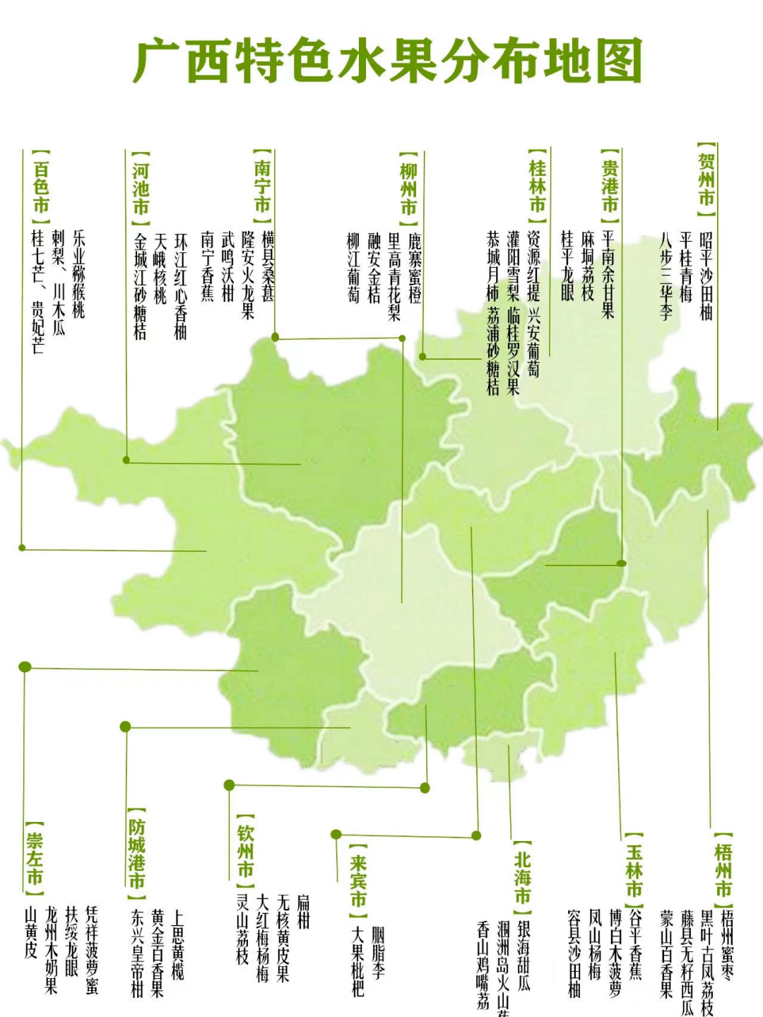 而广西之所以能坐稳水果大省,即离不开得天独厚的地理和气候环境,也少不了自身的后天努力。广西既有亚热带季风气候又有热带季风气候的优势,全区年降水量高达1694.8mm,光照充足、雨水充沛、气候适宜,自古以来就是我国产糖的重镇,这片流着蜜的土地,如今同样满足我国大部分水果的生长需求。