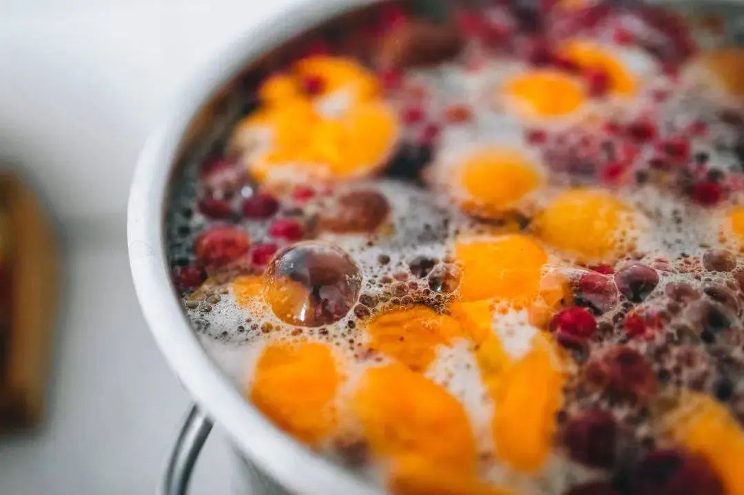 广西酸嘢。图源:网络将材料洗净切好后用酸醋、盐和糖腌制一段时间,再加入辣椒粉和椒盐搅拌均匀,一口下去,瞬间提神,同时还能解渴、除湿气。穿梭在广西城乡的街头巷尾,你总能轻易地找到流动的酸品摊。而不爱吃酸辣口味的人,也能在广西找到归宿——水果捞。除了与芋圆、西米、凉粉,和红糖水、椰奶、牛奶搭配的常规版水果捞,广西还有着独特的“火焰水果捞”,或者叫“水果煮米酒公文包”。罗汉果、党参、桂圆、红枣加上任意钟爱的水果,当然,重点是要加米酒,一碗下肚“喝起来甜甜的,喝完颠颠的”。