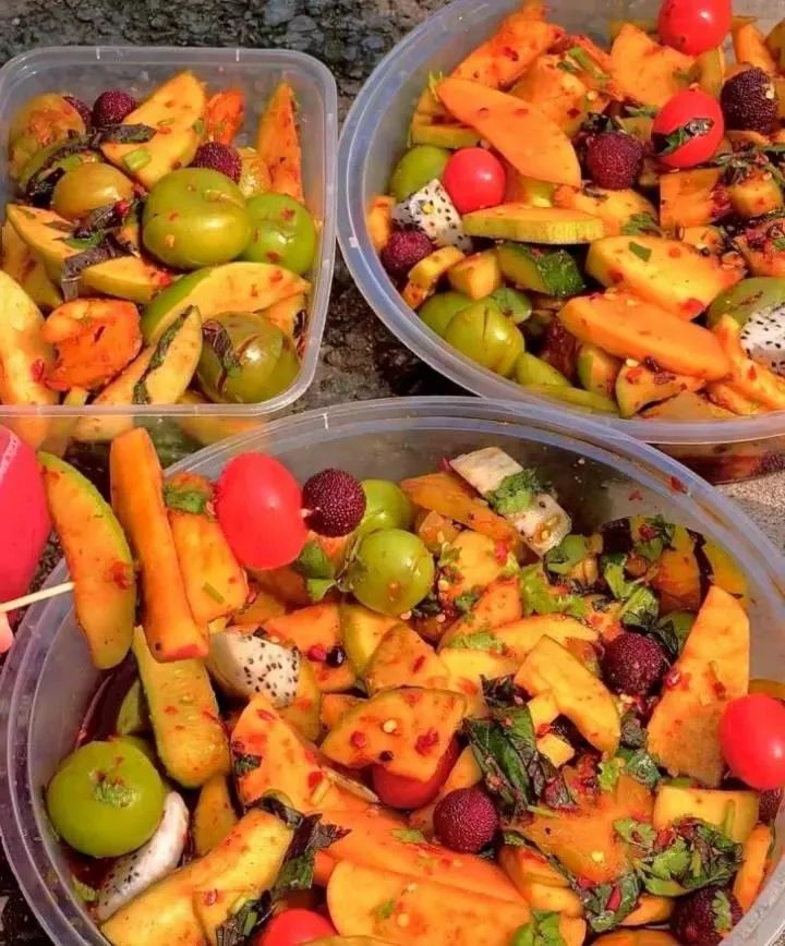 广西的每一寸土地,都有其“拿手”的水果,新鲜好吃到让人欲罢不能。03不仅量大还吃得“花”而广西水果令人怀念的,不止价格,还有味道。这得益于广西人吃水果的方式异常丰富,堪称“玩出朵花”。用罗汉果泡茶、用木瓜做糖水、用芒果做果干、在汤里用甘蔗去除羊肉的腥味……又或者,直接在新鲜水果里加糖、加盐、加酱油、加蒜蓉、加辣椒粉……只有想不到,没有加不了。其中最为出名的当属“广西酸嘢”。所谓英雄难过美人关、美人难过酸嘢关。酸嘢,顾名思义,就是“酸的东西”各式新鲜果蔬切块后,配以辣椒粉、盐、糖,或搅拌即食,或加入食醋、酱油酿制一段时间,递到食客手中就是一套酸、甜、辣兼备的开胃小吃,这样的风味尤其受喜酸喜辣的女性群体喜爱。大部分酸嘢会选用六七成熟的李子、青芒或者青木瓜,当然,也不完全局限于此,菠萝、桃子、梨子、豆角、萝卜、黄瓜、莲藕、杨桃、大蒜等,只要做的人动了“想吃”的想法,加什么都不奇怪。