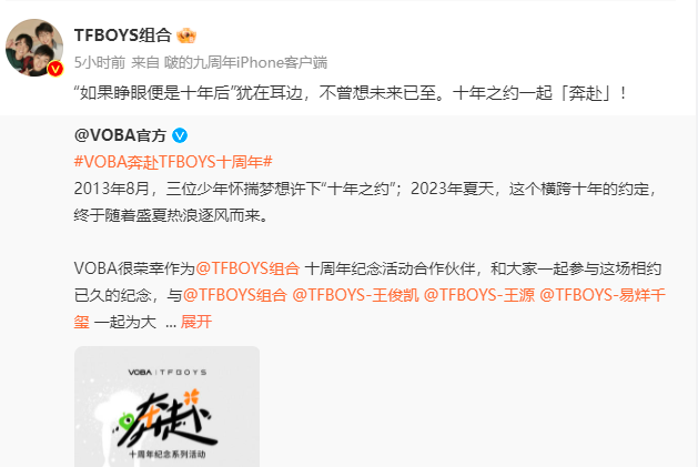 TFBOYS是中国内地男子演唱组合,由王俊凯、王源、易烊千玺三名成员组成。2013年8月6日,TFBOYS发布组合形象宣传片《十年》,正式出道。《十年》这首歌是TFBOYS的第一首原创歌曲,也是他们的出道曲,歌词中有这样一句:“我们约定十年之后再相见”。这句话寄托了三位少年对未来的憧憬和对彼此的承诺,也成为了他们和粉丝之间的一份约定。