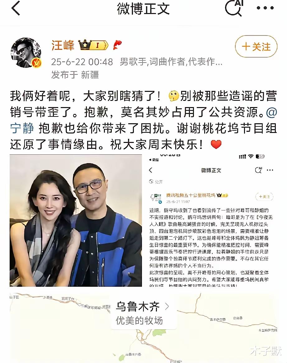 在热度炒起来以后,汪峰的声明虽然迟了但是还是来了,他不仅亲自霸气护女友森林北,表示“我们好着呢”,而且还晒出了两个人的合照,并且IP地址已经显示在森林北的家乡“乌鲁木齐”,表示两个人在一起。