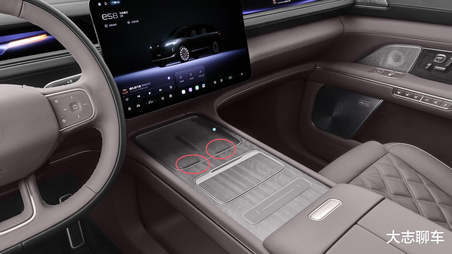 第二点:无线充有出风口,蔚来ES8的无线充有个硬伤,那便是手机充久后会发烫,为了解决这个事情,蔚来就想到了一个解决办法,那便是给无线充也加装了一个空调出风口,利用空调来给手机降温,避免手机长时间充电发烫的问题。