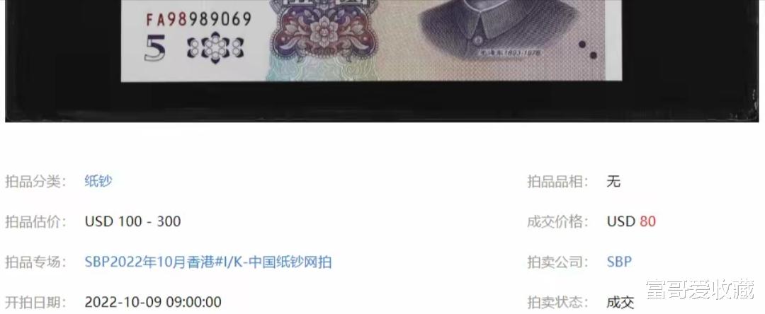 上面这张首发冠5元纸币,在SBP香港拍卖会中,就拍出了80美元!