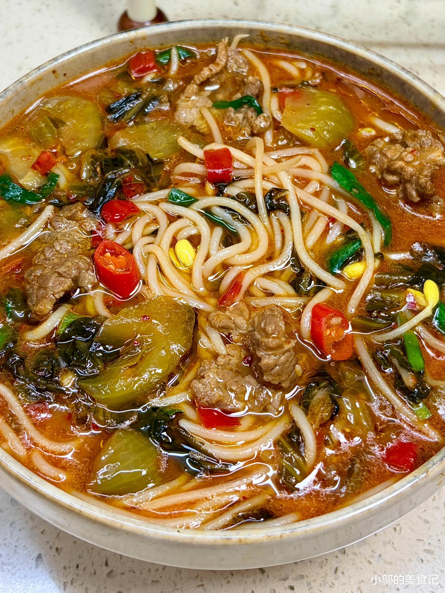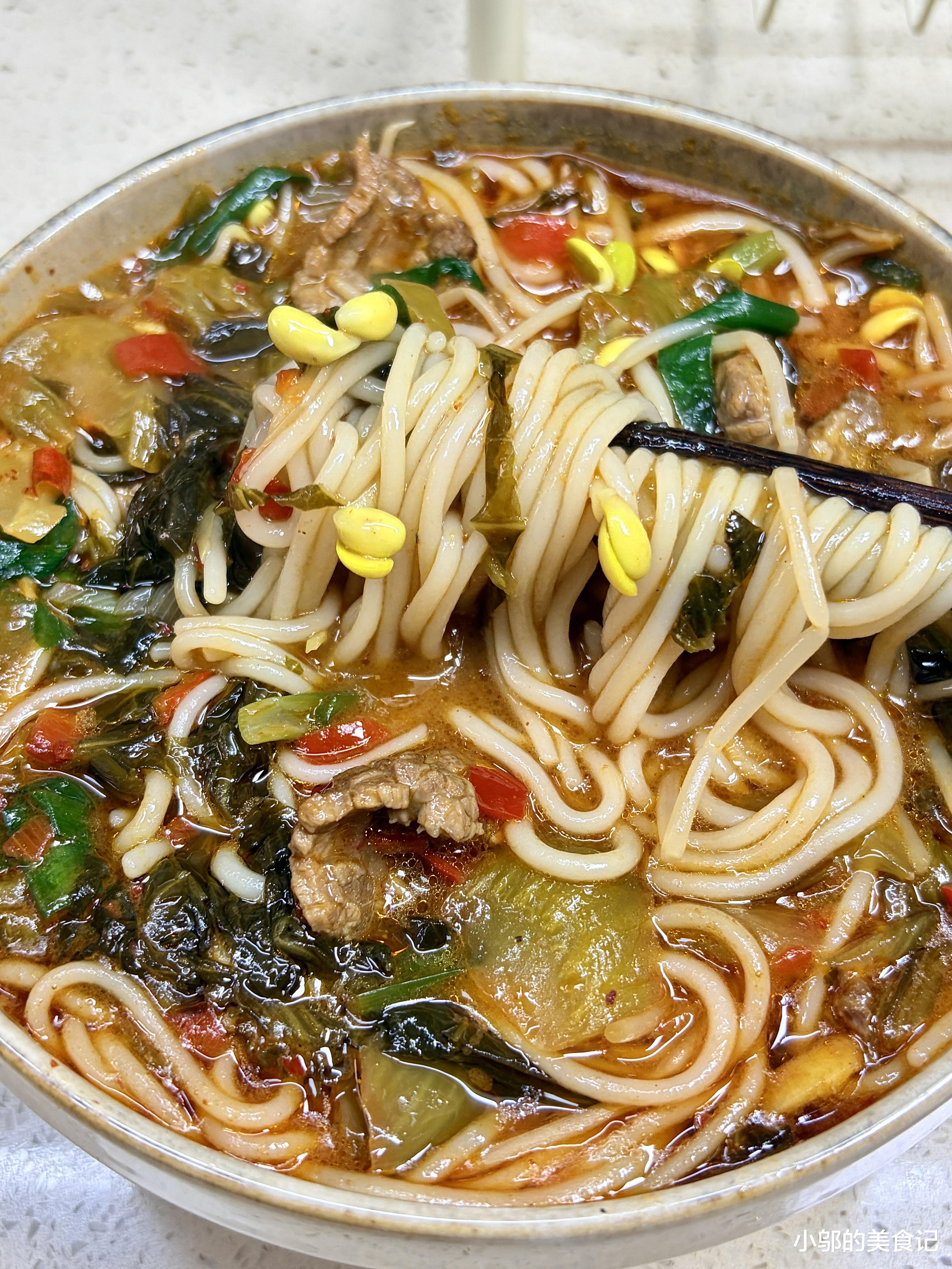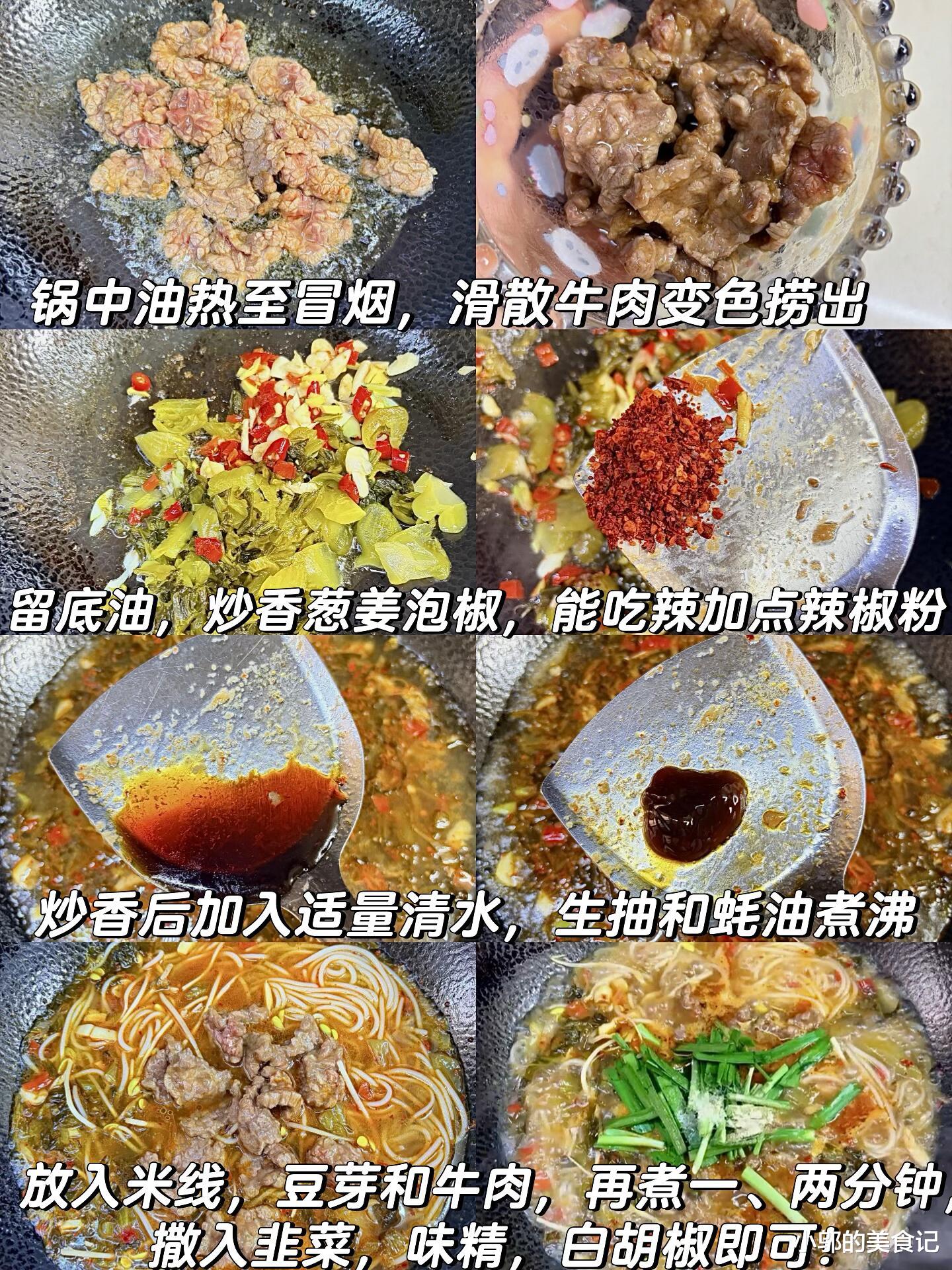 酸菜牛肉米线:酸辣鲜香,一口入魂的家常美味。每次闻到酸菜牛肉米线的香气,我就知道今天这顿饭绝对够味。酸菜的酸爽、牛肉的鲜嫩、米线的滑溜,再加上一勺热辣的汤汁,整个人都暖了起来。这道菜做法简单,食材也常见,关键是味道足够惊艳,酸辣开胃,连平时不爱吃辣的人都能吃上一大碗。