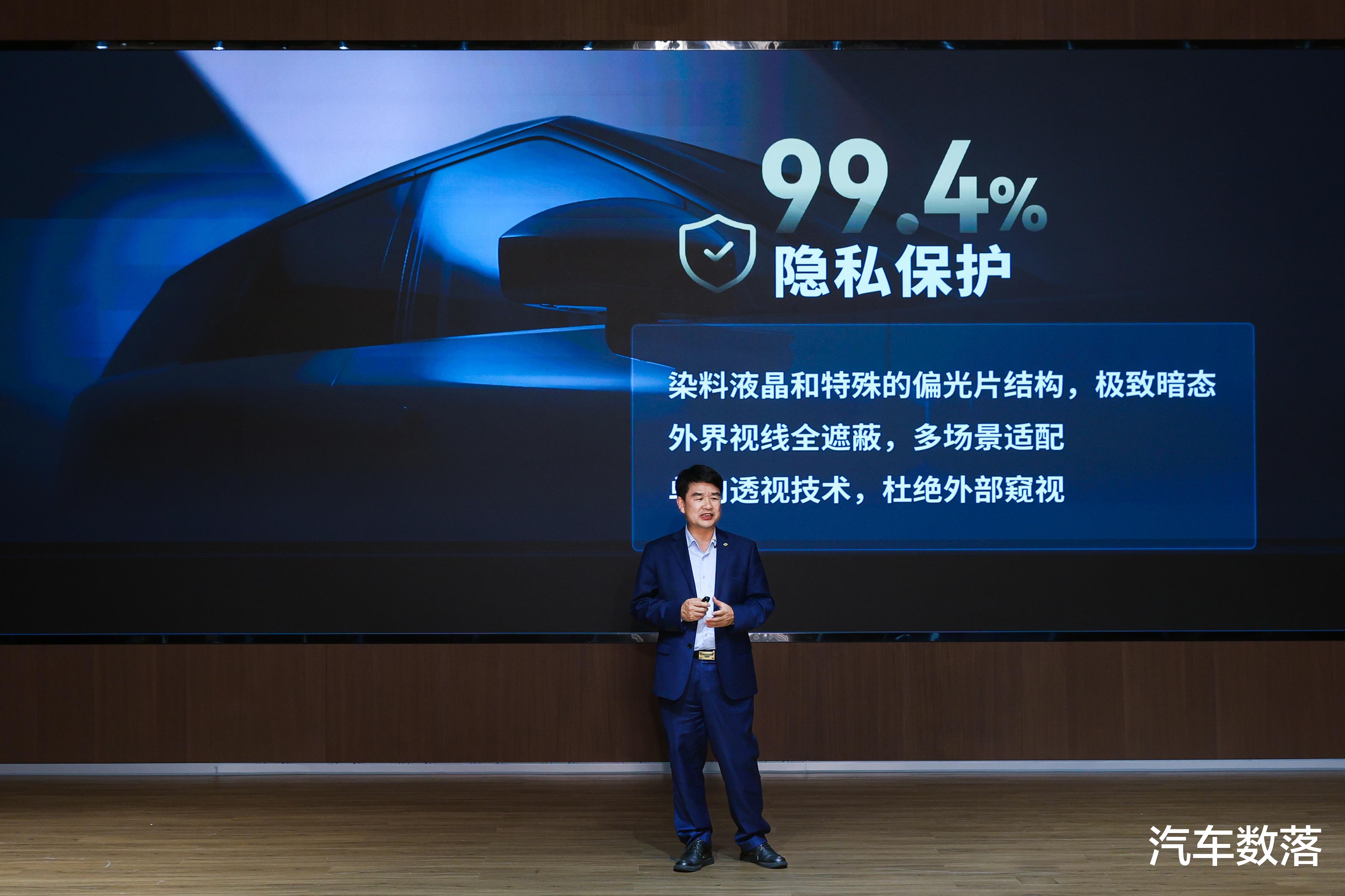 据介绍,AI调光隐私玻璃的应用场景很多:休憩露营时可秒级遮光,烈日下能安享沉浸式休憩;开启隐私模式,隔绝外界视线,适配车内办公、化妆等私密场景,给足安心感;带娃出行时,凭借99.9%紫外线隔绝率与99.4%可见光隔绝率,守护孩子娇嫩的肌肤与双眼,守护孩童香甜睡眠……