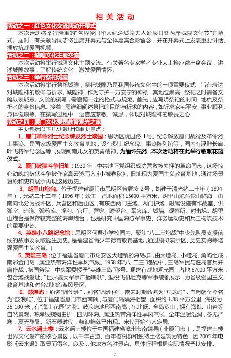 文化节期间将举办多项活动。红色文化交流活动开幕式将邀请有关领导出席并发表讲话,播放抗战爱国视频。城隍文化主题交流环节将组织专家学者讲述城隍故事,深入探讨传统文化。传统祭祀城隍仪式将遵循规范文疏,表达对城隍神的敬仰与祈求。此外,厦门文化爱国教育观光之旅将组织参观多个爱国主义教育基地和景点,包括厦门革命烈士纪念牌及烈士陵园(将举行敬献花篮仪式)、厦门破狱斗争旧址、胡里山炮台、英雄小八路纪念馆、英雄三岛战地观光园、鼓浪屿及云水谣土楼等地,具体行程根据实际情况安排。