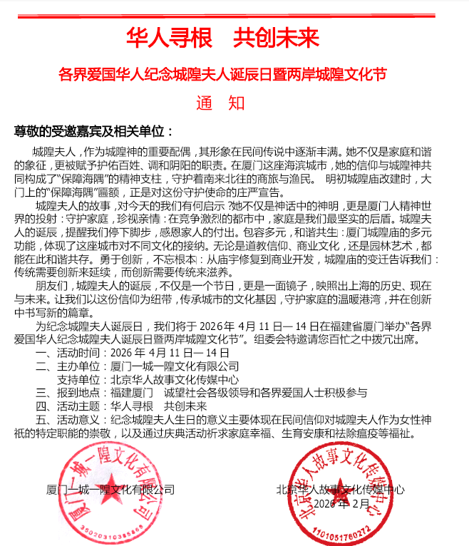 本站厦门讯 2026年4月11日至14日,“各界爱国华人纪念城隍夫人诞辰日暨两岸城隍文化节”将在福建省厦门市举行。本次活动由厦门一城一隍文化有限公司主办,北京华人故事文化传媒中心支持,旨在纪念城隍夫人诞辰,弘扬传统文化,激发爱国情怀。