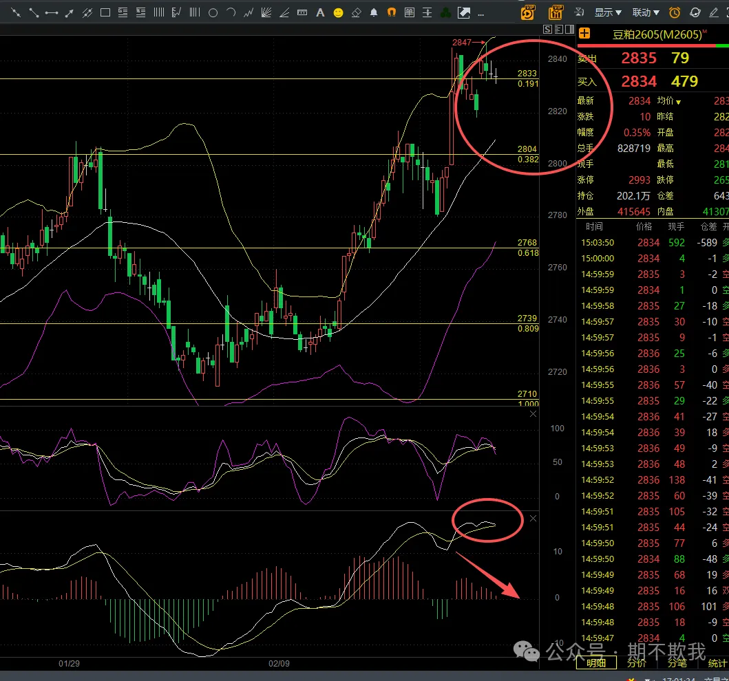 豆粕2605合约操作策略(2026年2月26日夜盘)【核心基本面(高位震荡整理,供需博弈延续)】供需与库存:日内增仓放量、震荡上行。核心逻辑:南美丰产 + 国内高库存压制上行,但养殖需求回暖 + 成本支撑 + 低位反弹,短期震荡偏强。