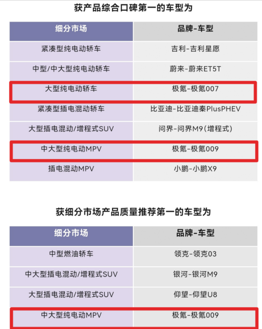 而所有技术的终点,是市场与用户的检验,说白了就是检验产品到底靠不靠谱。在杰兰路最新发布的中国汽车推荐度研究(NPS)报告中,极氪NPS值在最新评估中显著提升,净推荐值冲进 “强信心” 阵营。其中009、007两款车也荣获中国汽车推荐度(NPS)研究中斩获细分市场产品质量与综合口碑第一。这两个“第一”的含金量有多高?。这么说吧,“质量推荐”关乎可靠性与故障率,是产品基础的体现;“综合口碑”则涵盖了设计、性能、智能、服务等全方位体验。能在竞争这么激烈的细分市场里,同时把这两项第一拿到手,说明它那些技术研发的成果,已经成功地走完了从实验室参数到让用户点头满意的“最后一公里”,变成了实实在在的市场认可。