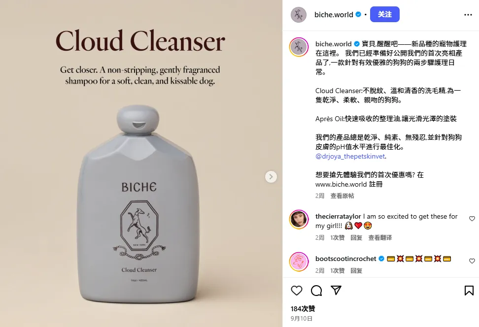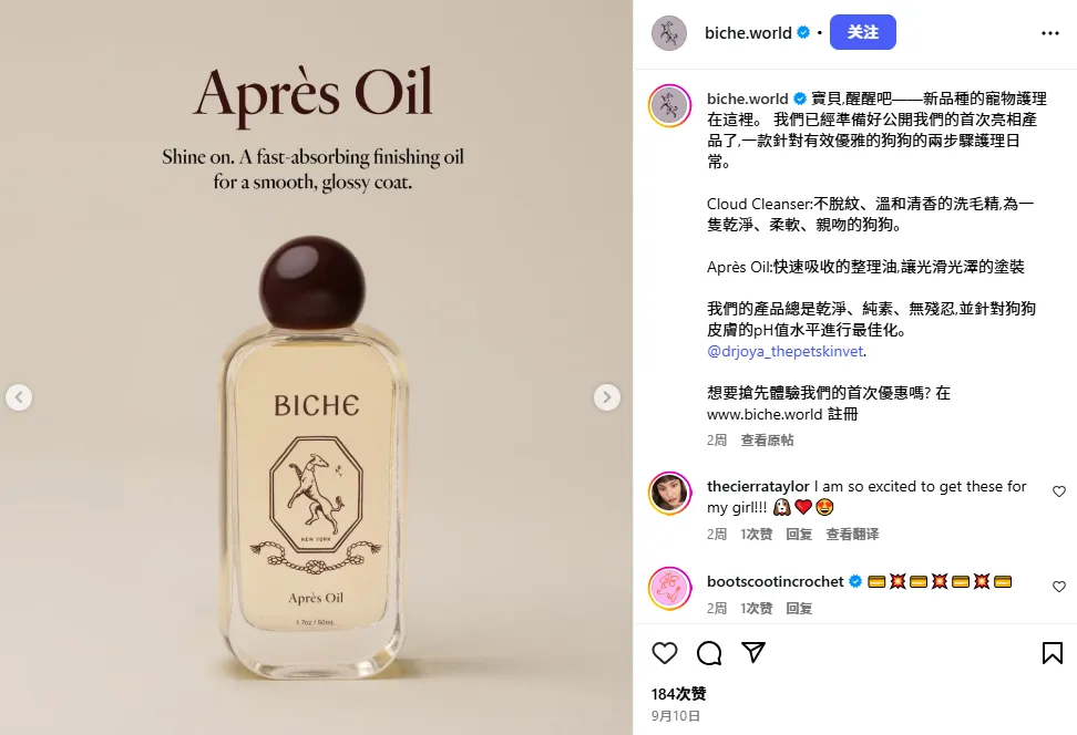 而产品到底定价多少呢?Biche还没有官宣,不过其在9月中旬公开了两款新品——宠物沐浴露和护毛精油(现在并没有官方翻译,所以只归了个类),而在介绍产品时,Biche特别标记了其“成分纯净”、“纯素配方”、“不经动物测试”、“根据狗狗皮肤pH值优化”的那个标签,且标记了合作的兽科皮肤科医生的账号。