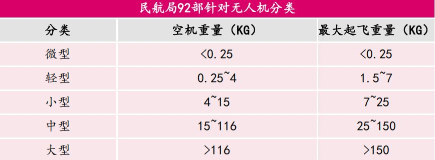 民航局92部根据体型将无人机分为微、轻、小、中、大型,其中微轻型无人机无需适航取证;各地政府出台的低空经济政策中,将此标准作为划分依据,对不同机型给予不同额度的补贴。