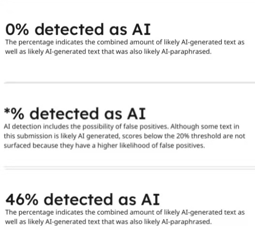 在Turnitin查重AI率报告中,AI率百分比通常有3种表现形式。0%表示论文没有检测到AI写作痕迹,*%表示论文AI率是在1%-19%范围内,为防止系统检测过程中的误判,就用*号代替,当AI率≥20%时,报告上就会显示具体数值(如46%)。