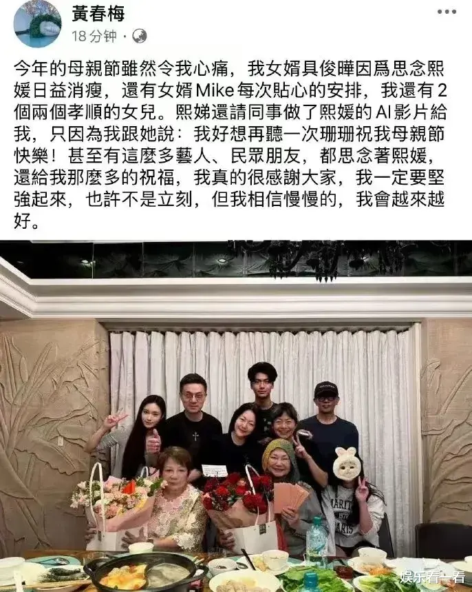 2025年5月11日,大S母亲黄春梅在母亲节当天首次公开全家近照。