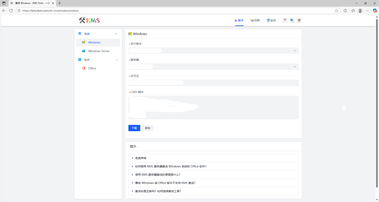 3、kms这是一个可以一键激活windows或office的网站,每天都在助力上万台电脑完成系统的激活网站使用超级简单。比如想要激活windows系统,只需选择系统,再选择系统版本,然后就会弹出三种激活方式进行选择。如果对激活流程不熟悉,还可以点击查看教程。