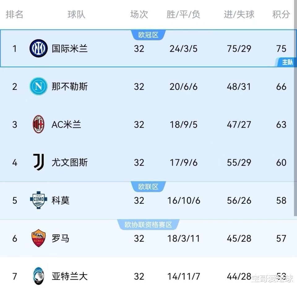AC米兰63分排名意甲第3,领先第4名尤文图斯3分,领先第5名科莫5分,如果科莫本轮战胜国米,那么AC米兰将只领先科莫2分,领先尤文图斯3分,以AC米兰近期糟糕的状态,在联赛还有6轮的情况下,被这两支球队反超,跌出前四可能性并不小,同样的情况也适用于尤文图斯。在科莫输给国米之后,尤文图斯也保住了意甲第4名的位置,掌握了争四主动权,所以就能理解为什么尤文图斯和AC米兰为什么会为了国米的胜利而欢呼了。科莫58分排名第5,罗马57分排名第6,距离前四分别差了2分和3分,这两队依然有希望争夺下赛季欧冠资格,亚特兰大53分排名第7,基本上已经无缘下赛季欧冠了。