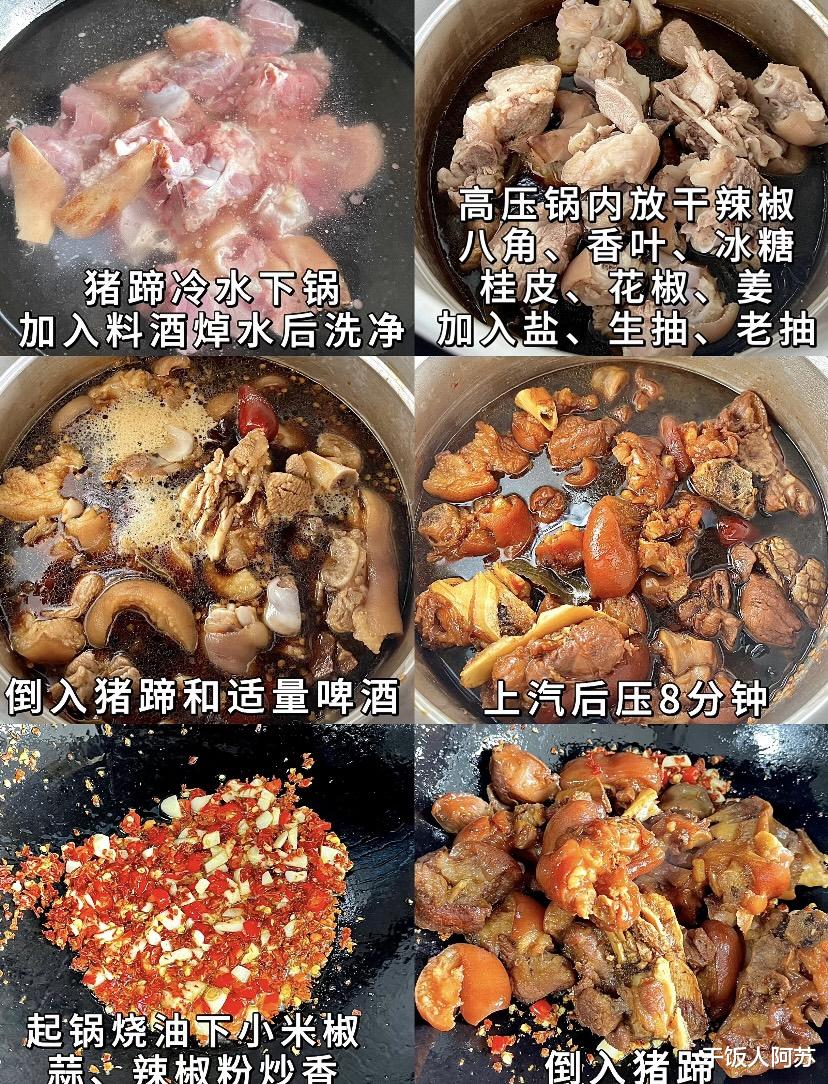 接下来,为了让猪蹄达到软糯脱骨的口感,我们需要借助高压锅的力量。将焯好水的猪蹄放入锅中,加入足量的清水,再放入灵魂伴侣——干辣椒、八角、香叶、桂皮、花椒和姜片,这些香料是构建这道菜复合香气的骨架。接着,倒入生抽提鲜,老抽上色,再放入一小把冰糖,它能中和辣味,让汤汁的味道更加醇厚回甘。最后,别忘了倒入适量的啤酒,啤酒中的酶能让肉质更嫩,同时增添一抹独特的麦芽香气。盖上锅盖,上汽后压制八分钟。这个时间足以让猪蹄变得软烂,但又不会过于松散,保留了恰到好处的嚼劲。