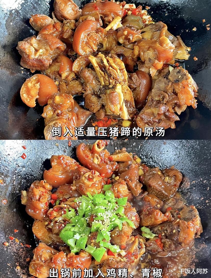 为了让味道更加融合,可以沿着锅边淋入少许压猪蹄的原汤。这勺原汤是精华所在,它浓缩了所有香料和肉类的鲜味。转大火快速收汁,让汤汁变得浓稠,紧紧地包裹在猪蹄表面,形成一层油亮的光泽。在即将出锅前,撒入一把切碎的青椒,不仅能增添一抹清新的色彩,还能带来一丝爽脆的口感,平衡整体的油腻感。最后,根据个人口味加入少许鸡精调味,翻炒均匀即可装盘。