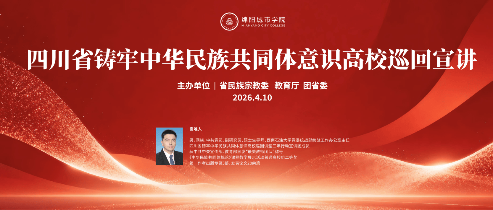 为进一步深化铸牢中华民族共同体意识教育,引导广大师生牢固树立中华民族共同体理念,4月10日下午,由四川省民族宗教事务委员会、四川省教育厅、共青团四川省委联合主办的“铸牢中华民族共同体意识高校巡回宣讲”活动,在绵阳城市学院安州校区顺利举行。