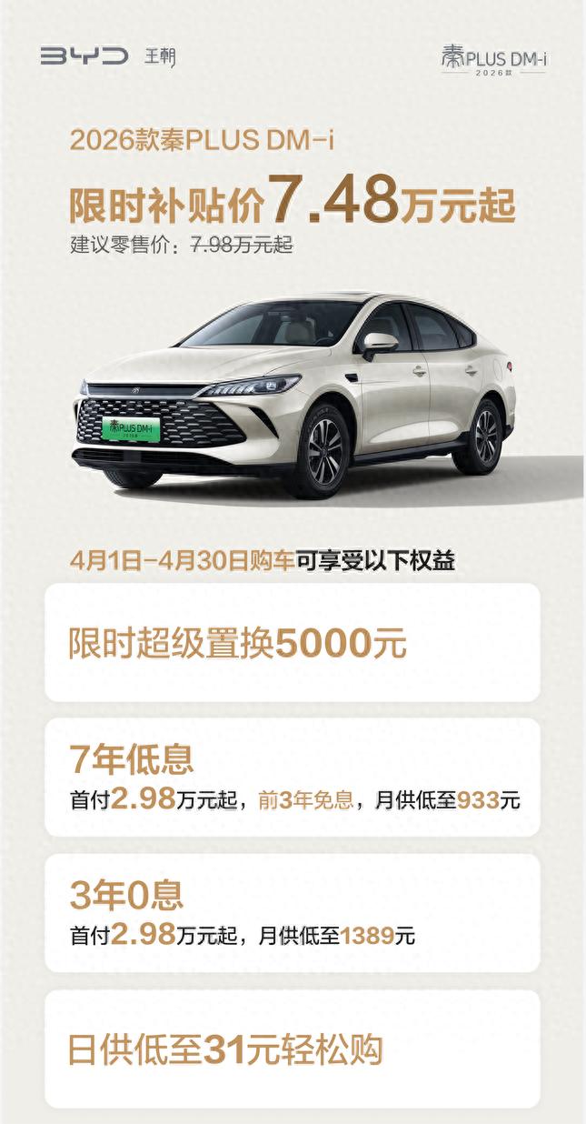 4月1日,比亚迪官方推出2026款秦PLUS DM-i限时购车权益,覆盖置换补贴与低息金融方案两大维度,活动截止日期为4月30日。