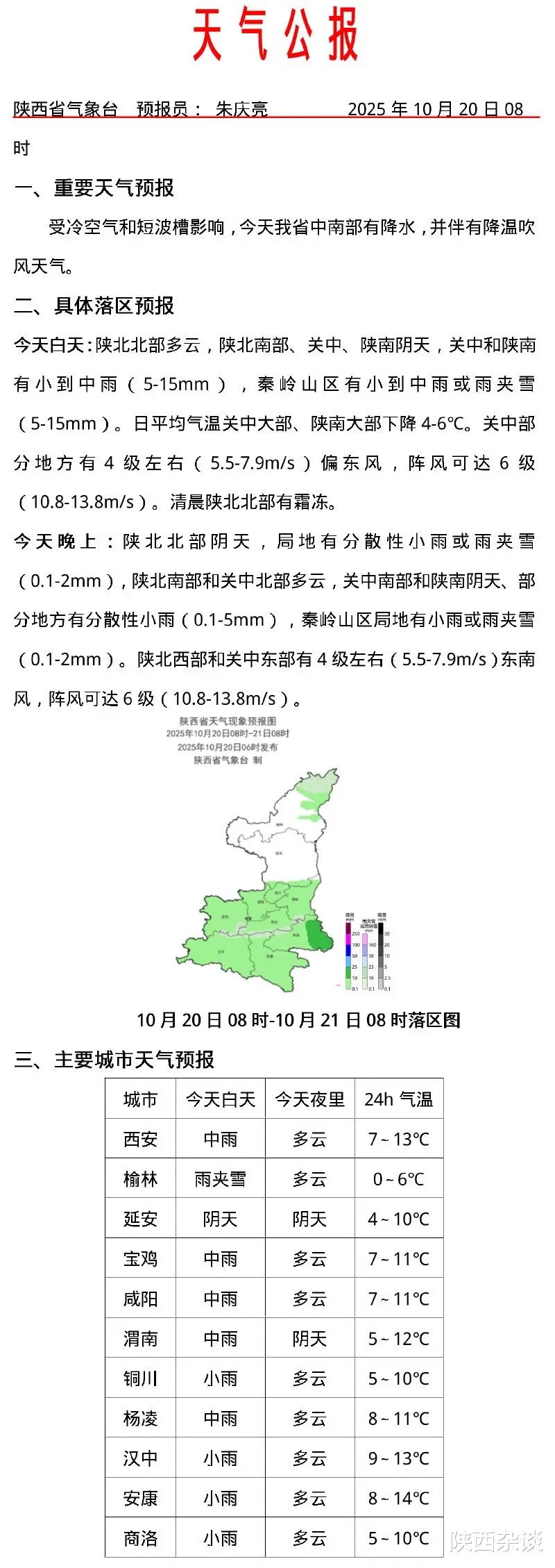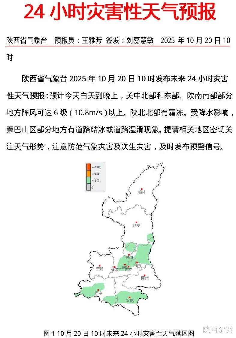 预计今天白天到晚上,关中北部和东部、陕南南部部分地方阵风可达6级(10.8m/s)以上。陕北北部有霜冻。受降水影响,秦巴山区部分地方有道路结冰或道路湿滑现象。提请相关地区密切关注天气形势,注意防范气象灾害及次生灾害,及时发布预警信号。