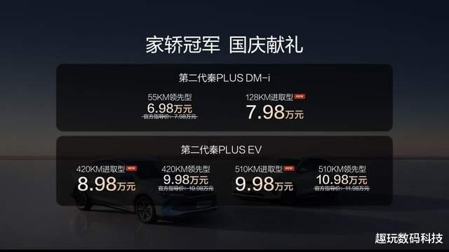 9月25日,比亚迪第二代秦PLUS双车上新,发布了秦PLUS DM-i 128KM进取型、秦PLUS EV 420进取型、510KM进取型等三款新车,同时全系车型享国庆献礼价,限时6.98万元起。