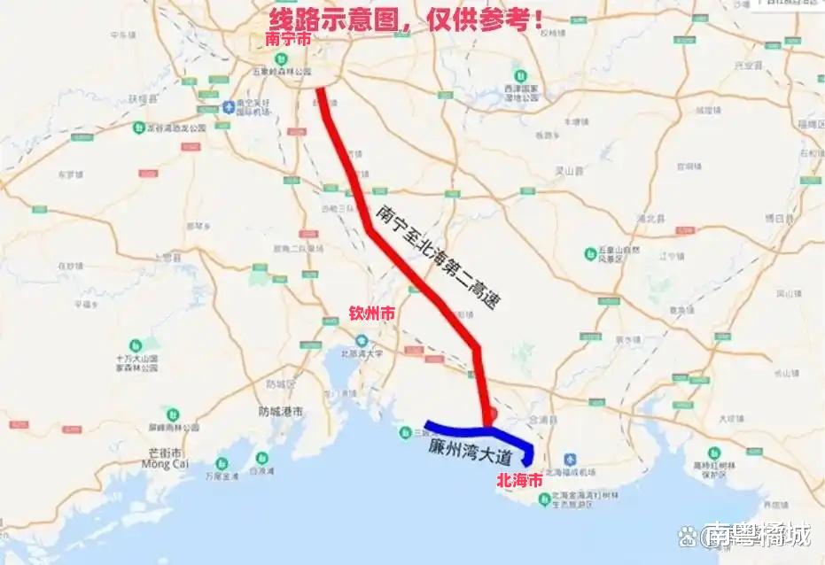 G7522贵阳至北海高速公路南宁至北海段,是国家高速公路网兰州—海口高速公路(G75)的重要并行线,也是《国家综合立体交通网规划纲要》和《广西高速公路网规划(2018-2030年)》中"纵10线"的关键组成部分。该项目被俗称为"南宁至北海第二高速公路"。项目主线全长约153公里,其中新建里程138.67公里,同步建设南宁市入城段2.5公里。路线起于南宁市邕宁区州同村附近,总体沿西北往东南方向布设,依次经过南宁市邕宁区、钦州市钦北区、钦南区、北海市合浦县,终点位于合浦县烟楼村西南侧,顺接廉州湾大道。