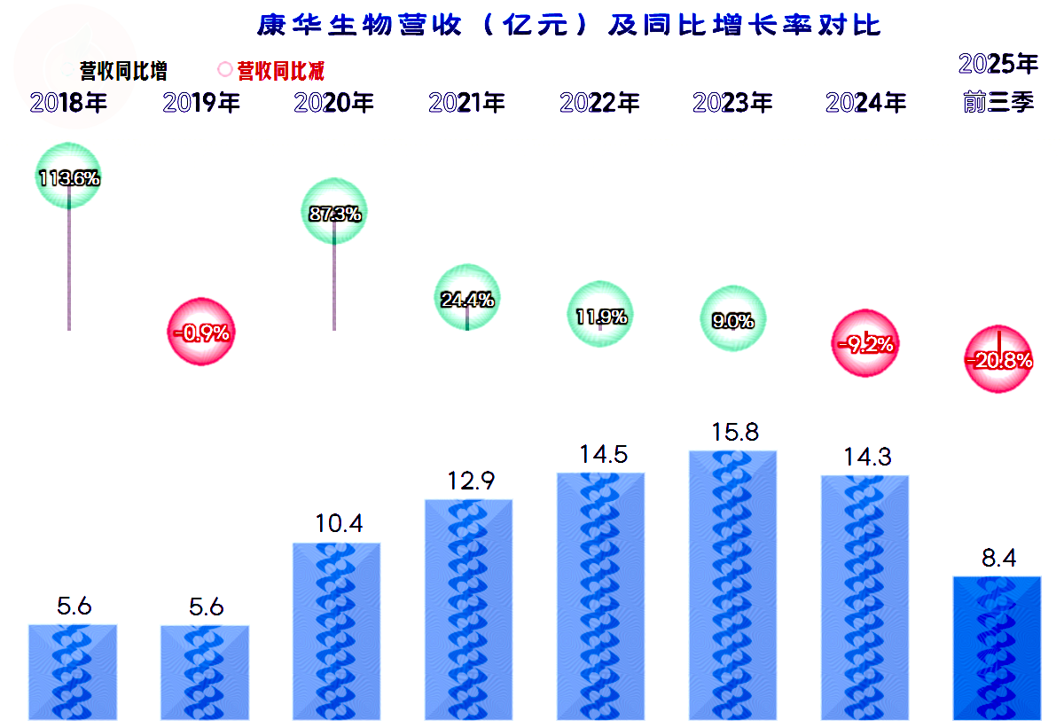 在疫情结束后的2023年,康华生物的营收创下了15.8亿元的峰值水平,2024年和2025年前三季度都在同比下跌,2025年前三季度跌幅有扩大的趋势。