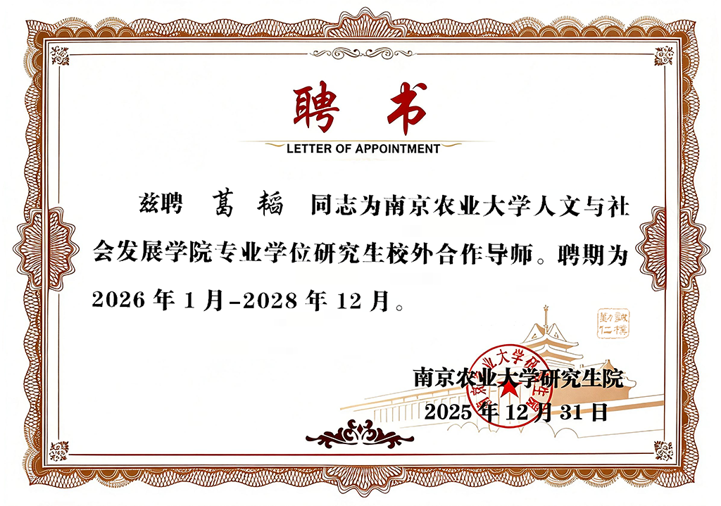 为进一步落实专业学位研究生双导师制,全面加强专业学位研究生实践创新能力培养,近日,南京农业大学正式聘请著名紫砂工艺美术师、宜兴市葛盛陶庄文化艺术有限公司董事长、宜兴市荆溪紫砂艺术院院长葛韬先生,担任人文与社会发展学院专业学位研究生校外合作导师,聘期为 2026 年 1 月至 2028 年 12 月,与学校共同书写传统工艺传承与高层次人才培养的新篇章。