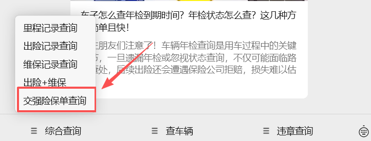进入公众号后,点击底部菜单栏,找到“交强险查询”入口,直接点击进入;