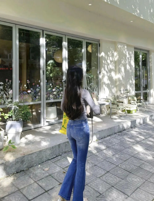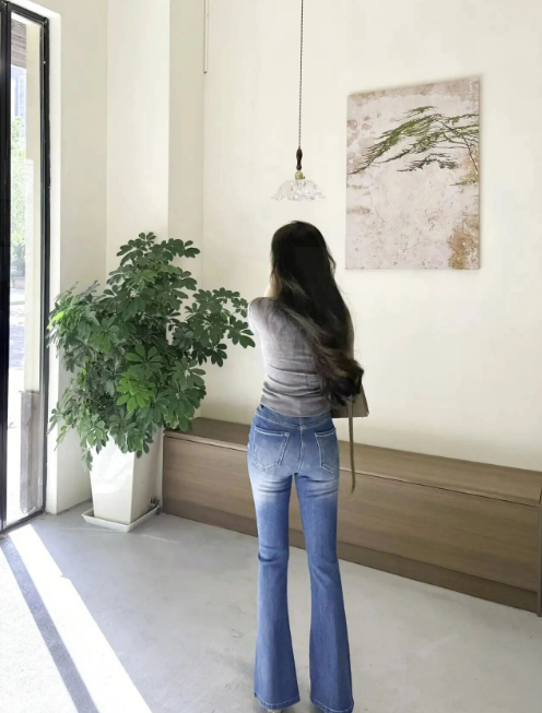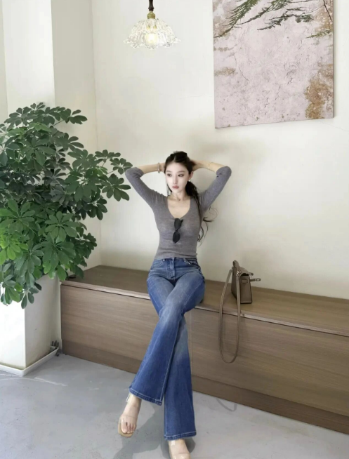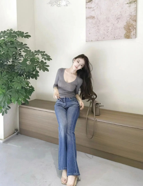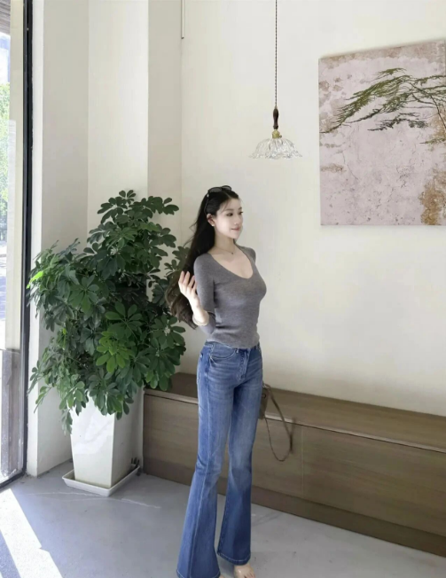 灰色 U 领针织衫搭配微喇牛仔裤,藏不住的好身材,显瘦又时髦