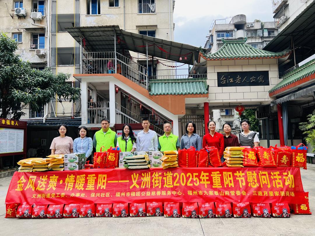 岁岁重阳,今又重阳。为弘扬中华民族尊老、敬老、爱老的传统美德,在重阳节来临之际,由义洲街道党工委、办事处主办、保兴社区、福州市福延公益慈善服务中心、福熹施鱼丸、福州市九案泰山府管委会、三迪月星家居商场共同协办,的“金风送爽·情暖重阳”2025年重阳节慰问活动在台江区老人公寓温情启幕,为辖区高龄老人送上了节日的关怀。